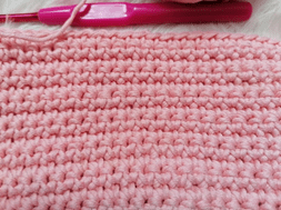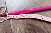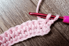 | Insert hook in the last stitch of the previous row under top 2 loops, bring the yarn over the hook from back to front and draw yarn through stitch and up onto the working area of the crochet hook. You now have two loops on the hook. Again, bring the yarn over the hook from back to front and draw it through both loops on the hook. Work a single crochet into each single crochet to the end, taking care to work in each stitch, especially the last stitch, which is easy to miss. You should have 19 single crochet stiches on the row. |