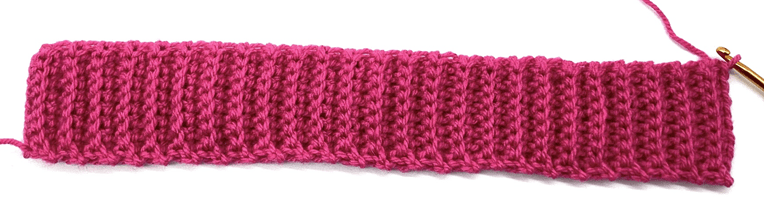 Starting row 2, we’ll be working all the stitches in the back loop only. To avoid loops at the edge, the last stitch of each row will be worked using both top.